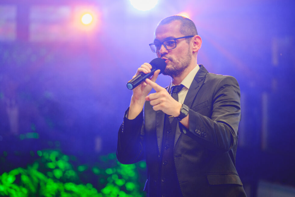 Jó minőségű vezetéknélküli mikrofont használok, hiszen így nem vagyok helyhez kötve. Ki tudok menni a vendégek közé, azonnal tudok reagálni mindenre.